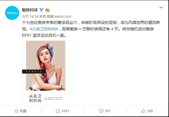 魅族科技官方微博放出消息,原本写道:十七世纪贵族专享的奢侈品丝巾,突破阶级架设的桎梏,成为风靡世界的潮流新宠。#从前卫到时尚#”,距离魅族x巴黎时装周还有4天。转发随机送出魅族EP51蓝牙运动耳机一副。