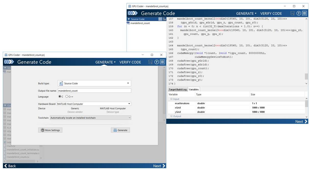 左图为GPU Coder app,右图展示了生成的CUDA代码