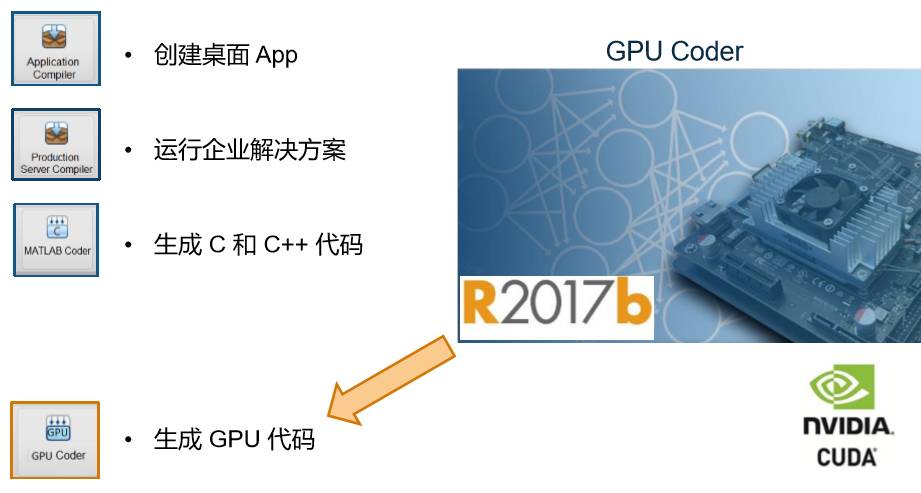 在 MATLAB 部署模型其实也很简单,MATLAB 很早就支持生成独立于其开发环境的其它语言,比如利用 MATLAB Coder 可以将 MATLAB 代码转换为 C 或 C++代码。而该最新版提供了新的工具 GPU Coder,我们能利用它将生成的 CUDA 代码部署到 GPU 中并进行实时处理,这一点对于应用场景是极其重要的。