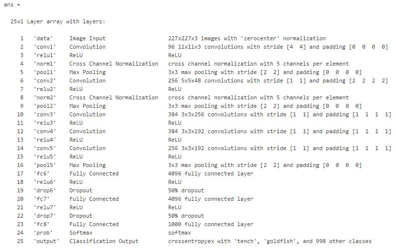 上面的语句将导入 AlexNet,并如下所示展示整个 CNN 的神经网络架构。其中 MATLAB 会展示所有的操作层,每一层都给出了层级名、操作类型和层级参数等关键信息。例如第二个操作层『conv1』表示一个卷积运算,该运算采用了 96 个卷积核,每一个卷积核的尺寸为 11×11×3、步幅为 4,该卷积运算采用了 padding。