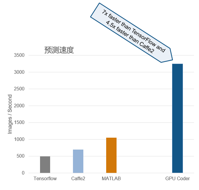 对于推断来说,新产品 GPU Coder 可自动将深度学习模型转换为 NVIDIA GPU 的 CUDA 代码。内部基准测试显示,GPU Coder 产生的 CUDA 代码,比 TensorFlow 的性能提高 7 倍,比 Caffe2 的性能提高 4.5 倍。