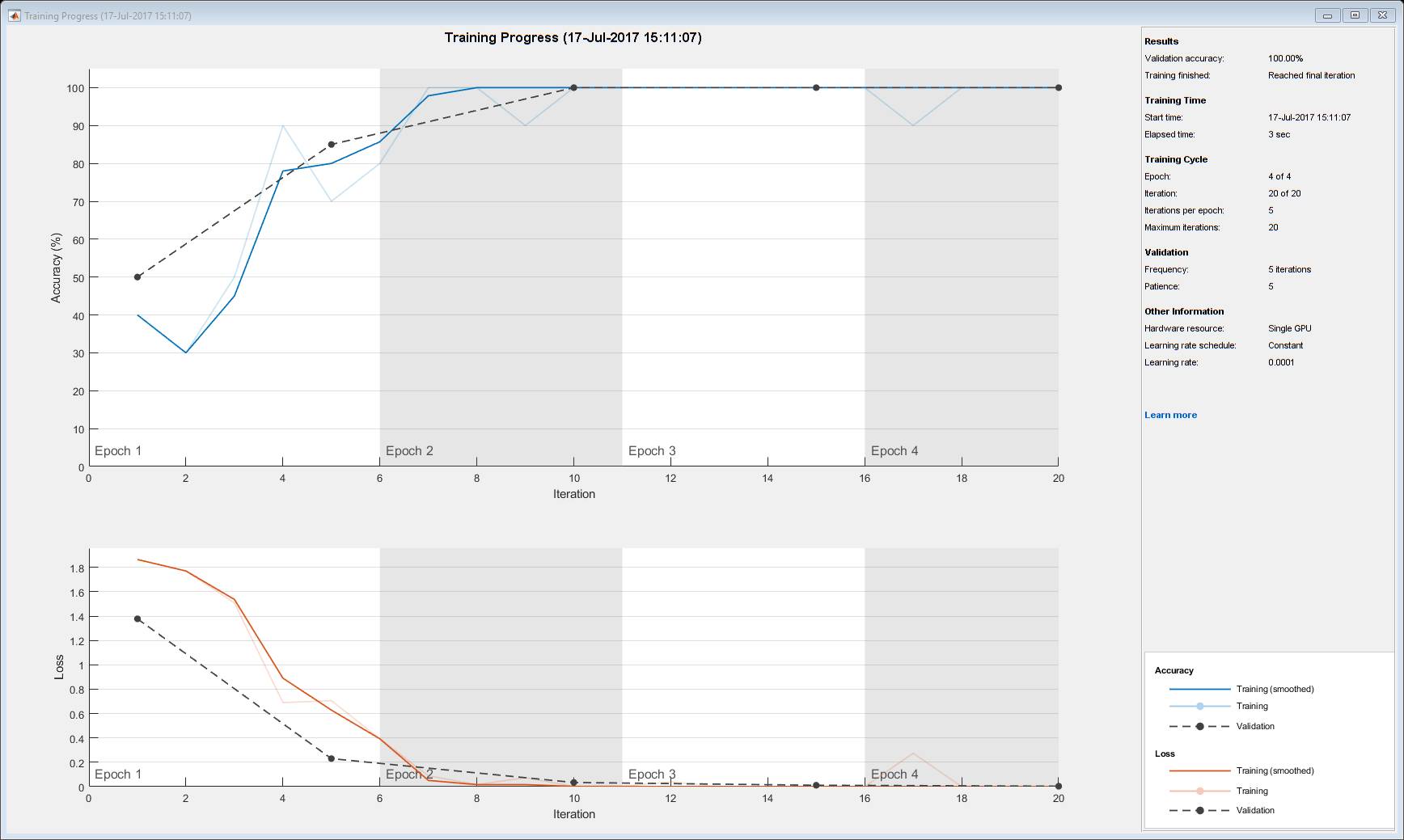 在模型训练中,另外一个比较重要的部分就是可视化,我们需要可视化整个训练过程中的模型准确度、训练损失、验证损失、收敛情况等信息。当然 MATLAB 一直以来就十分重视可视化,在上例执行迁移学习时,我们也能得到整个训练过程的可视化信息。如下所示,上部分为训练准确度和验证准确度随迭代数的变化趋势,下部分为训练损失和验证损失随迭代数的变化趋势,该迁移学习基本上到第 3 个 epoch 就已经收敛。