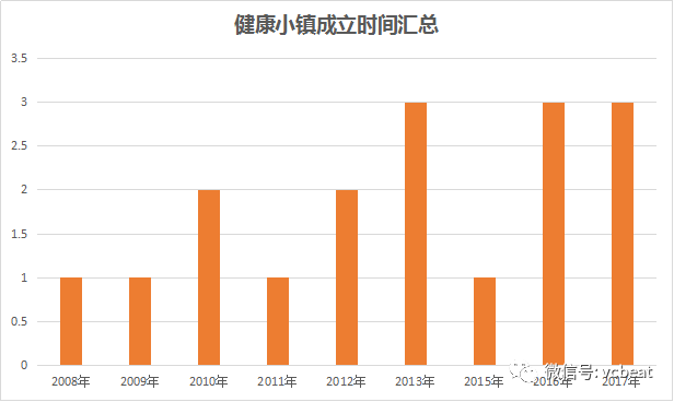 从各地区涉足健康小镇的时间来看,最早是2008年有1个城市,最多是2013年、2016年、2017年,均有3个省或市。如果以3年为节点,每3年健康小镇的建设均会增加,尤其是2010年-2013年和2015年-2017年,均出现爆发式增长。