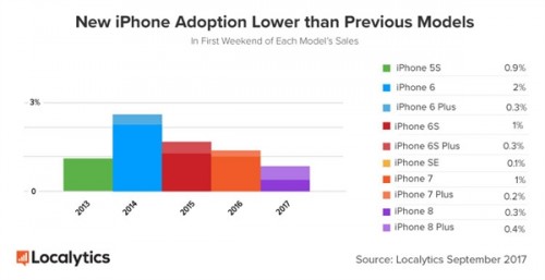 根据Localytics的研究报告也同样反映了这种趋势:iPhone 8系列发售后第一个周末,在全球所有销售的iPhone中只拿到了区区0.68%的份额,低于iPhone 6s/6s Plus时期的1.3%,也低于iPhone 7/7 Plus时的1.2%。
