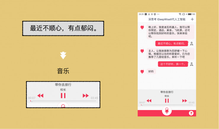 深思考会先为你放首歌舒缓一下心情,再利用机器学习根据以往听歌的爱好,推荐放松心情的歌,有点温暖小贴心哦!