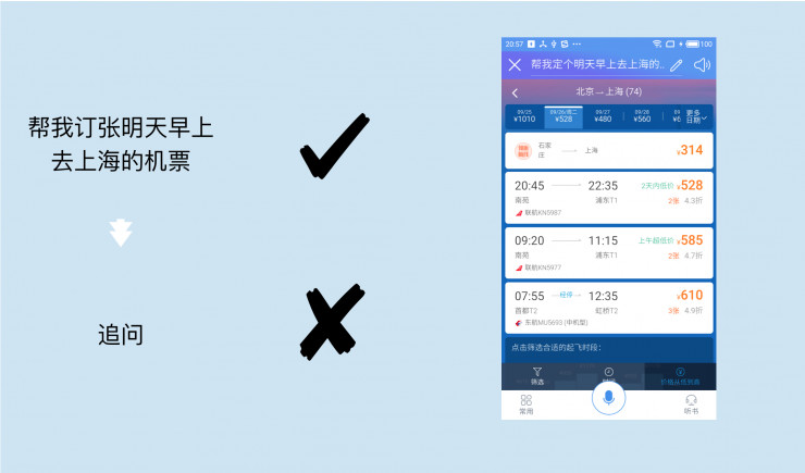 灵犀接入携程网。我们可以看到灵犀给出的结果会按照第三方的推荐,例如排在第一的是一条邻近路线和一张晚上8点多的低价票,而不是早上的机票。