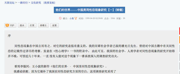 “一路同行”是天涯社区里的一个同性恋交流版块。最早的一个热帖发布于1999 年4月,目前点击量是5000 余次。它曾转载过李银河和王小波的调查报告——《他们的世界——中国男同性恋现象研究》(原书于 1992 年由山西人民出版社出版)。