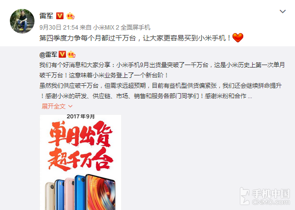 随后雷军表示:“我们有个好消息和大家分享:小米手机9月出货量突破了一千万台,这是小米历史上第一次单月破千万台!这意味着小米业务登上了一个新台阶!虽然我们供应破千万台,但需求远超预期,目前有些机型供货偏紧张,我们还会继续拼命提升!感谢小米的研发、供应链、市场、销售和服务各部门同学们!感谢米粉和合作伙伴!”