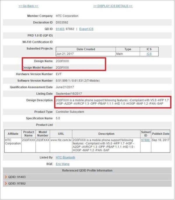 该机所配的充电头型号和充电输出规格与旗舰HTCU11相同,所以它极有可能是HTCU11Plus的国行版。之前HTC已经有多款型号为2Q3FXXX的新机获得了蓝牙组织认证,并显示支持蓝牙V5.0技术,这应该是HTCU11Plus针对全球市场的版本。