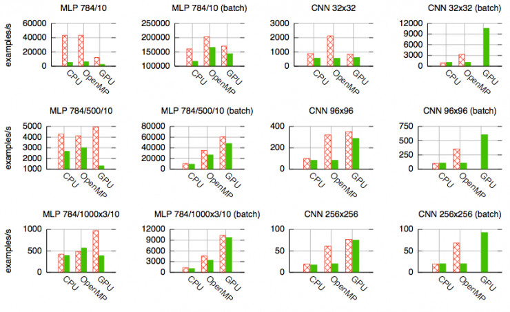 图中红色柱状图指Torch,绿色柱状图指Theano,可以看到Torch在大多数情况下性能都要优于Theano。