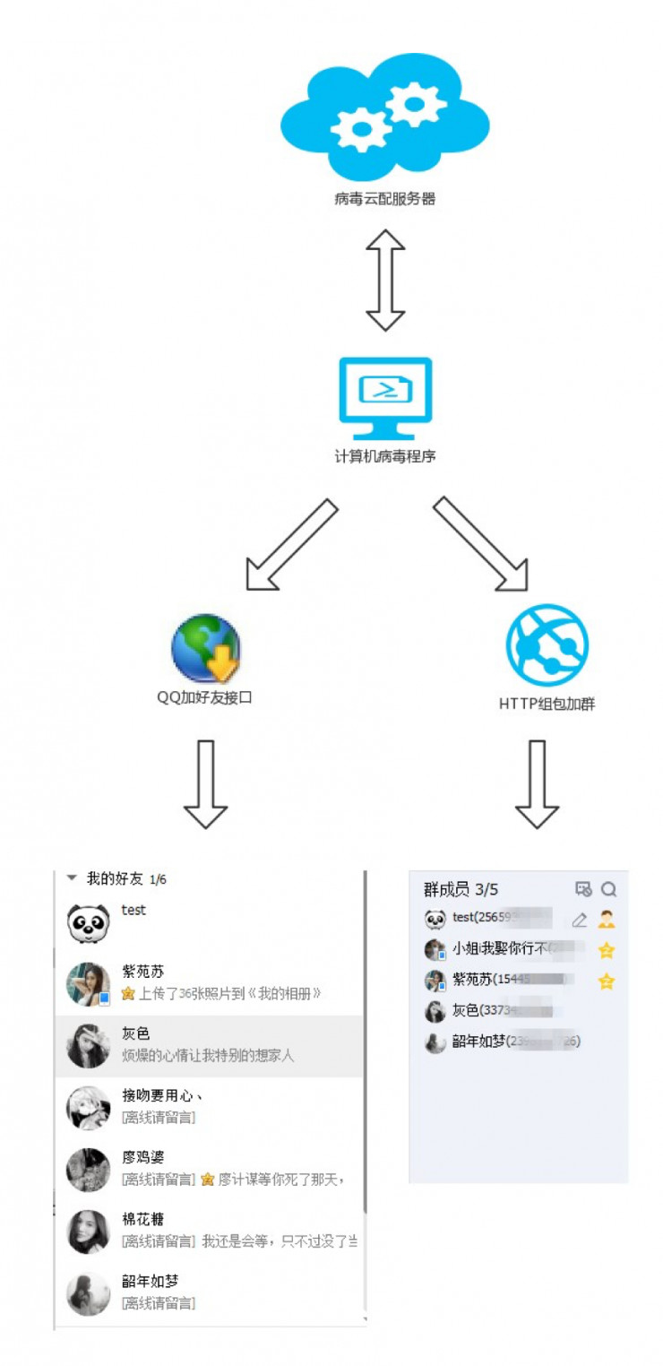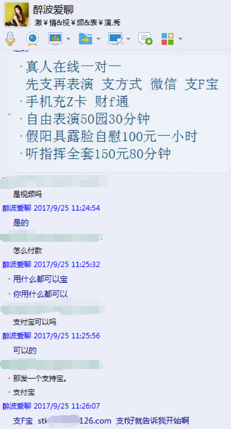 首先,非法组织找到了病毒木马作者,达成了合作的关系,于是在下载站,网盘等地投放病毒,受害者中招后,莫名其妙的加了一些不认识的QQ好友,这些好友,会在QQ空间和QQ群里投放一些“色情”广告,如果有用户抵挡不住 诱惑,按照广告中提示要求加了指定的QQ号(QQ的背后可能是一位扣脚大汉),对方会以诱惑性的美女图片来诱惑用户观看视频,用户需要支付价格在50RMB~150RMB的金额才能进行体验。而实际收款的却是扣脚大汉!