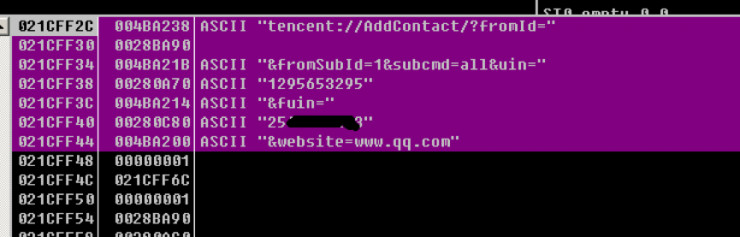c.获取完QQ号码后,启动Timwp.exe进程并传入相应的参数完成添加”tencent://AddContact/?fromId=5&fromSubId=1&subcmd=all&uin=1295653295&fuin=256*****53&website=qq.com”" target="_blank" rel="nofollow">www.qq.com”