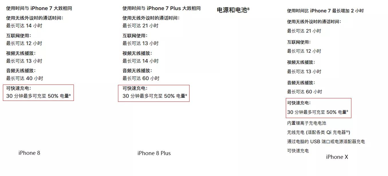这三款新 iPhone 都只写着 30 分钟最多可充至 50% 电量,但是 iPhone 8 的电池容量为 1821 毫安时,iPhone 8 Plus 的电池容量为2675毫安时,iPhone X 的电池容量为 2716 毫安时。换算下来,那么 iPhone X 的充电功率最高,最低是 iPhone 8。