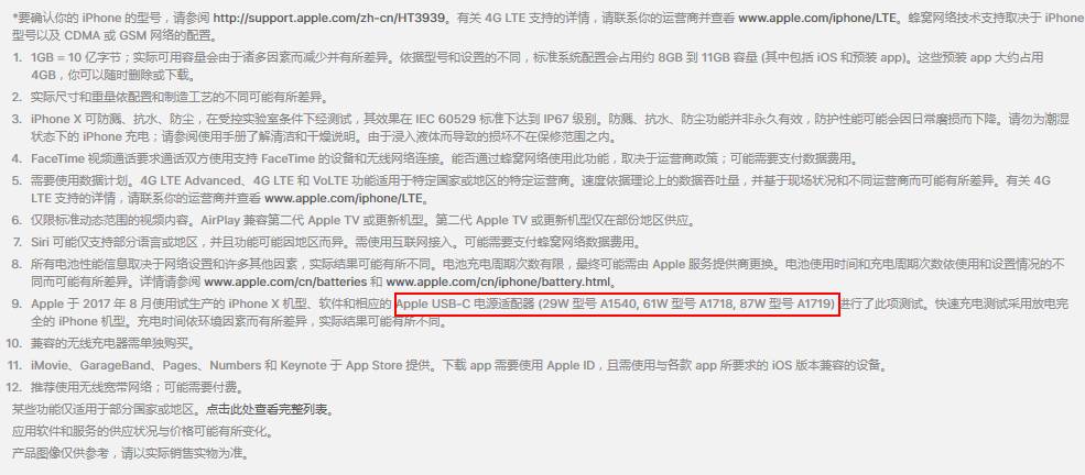 不过在今年,苹果好像听到消费者的呼声了。虽然在新品发布会上没有提及,但是苹果悄悄地在官网上最后一行注明 iPhone 8/iPhone 8 Plus 和 iPhone X 三款手机都是支持快充的。
