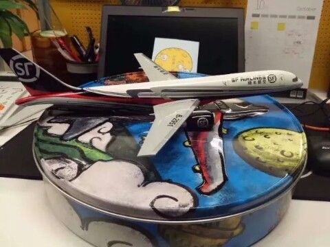月饼盒用飞机造型,是为了体现顺丰快递的速度之快,真是不放过任何一处打广告的地方啊。