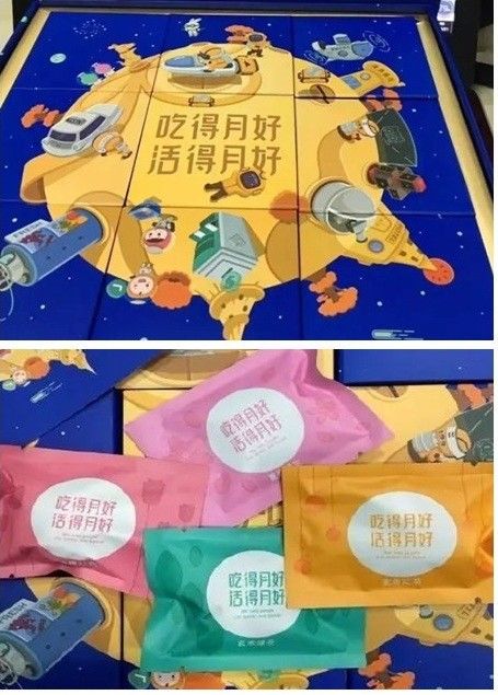 京东月饼包装脱颖而出,采用了独特的布袋式包装。今年的中秋主题是“智绘京东,赏味团圆”,京东一直强调智能化,也体现在了月饼主题上。