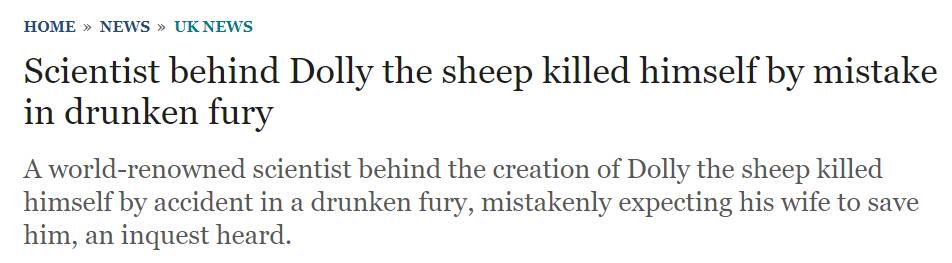 Nick Britten. Scientist behind Dolly the sheep killed himself by mistake in drunken fury. The Telegraph. 2013
