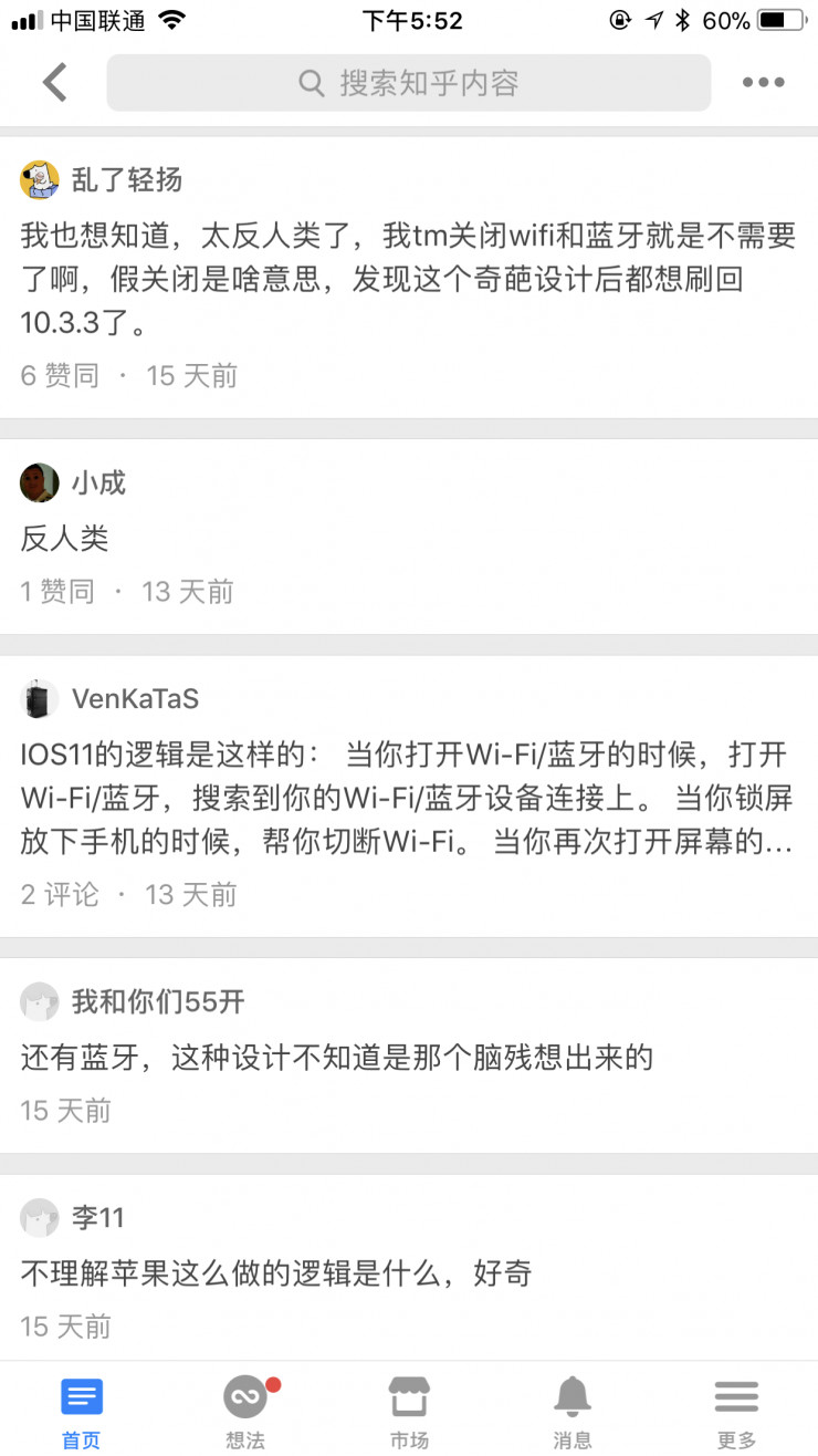知乎上关于 iOS 11 控制中心无法真正关闭 WiFi、蓝牙的反馈