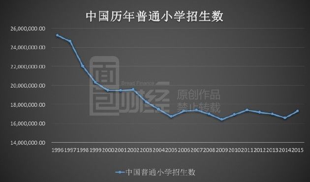 据统计数据显示,中国普通小学招生数自1996年以来一直处于下降态势,走出明显的“大L型”。1996至2005年断崖式下跌,从2524.7万人下降到1671.7万人,最近10年则持续低位徘徊,每年招生数维持在1600-1750万人,比1996年减少800万左右。