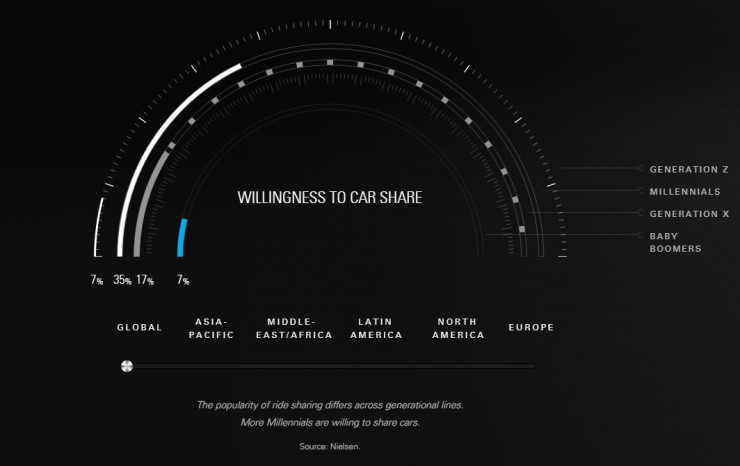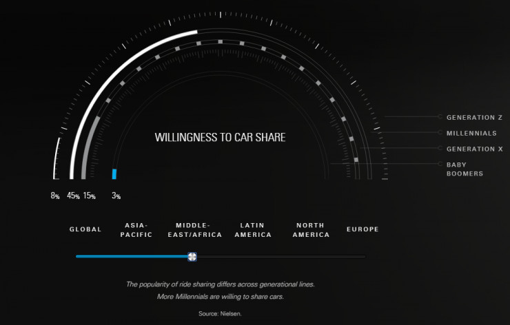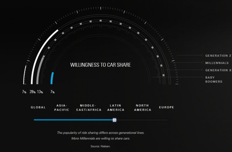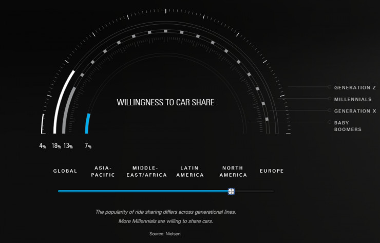 其中,Generation Z指新千年之后出生的人,Millennials指的是千禧一代,随着网络出生的一代人,Generation X代表上世纪60年代到80年代出生的人,而Baby Boomers则指婴儿潮世代,即1946年到1964年之间出生的人(雷锋网注)。图中由内至外,分别是Baby Boomers、Generation X、Millennials、Generation Z。可见,各大洲中千禧一代对共享私家车的接受程度更高。