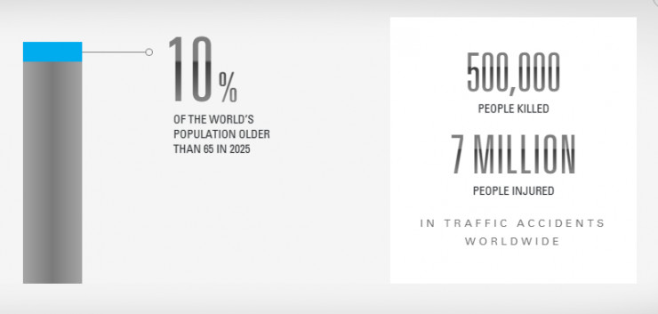 减少事故一直是汽车行业的首要目标,人口老龄化让这一目标有了更高的要求。根据经济合作与发展组织和日本总务省的数据,到2025年,全球将有10%的人口大于65岁。现今,全球共有50万人在交通事故中丧生,7百万人在交通事故中受伤。老龄化社会中,老年人司机将会更多,比起年轻司机,他们在一定程度上有更高的安全隐患。