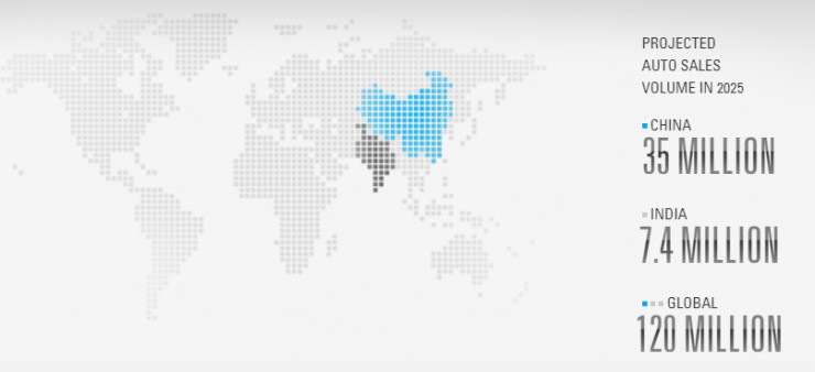 例如印度,到2025年将会成为全球第三大车辆市场,销量将达740万辆。而中国,则会在原有的繁荣汽车市场上再添增长,同时共享车辆服务也会迎来更大的市场。