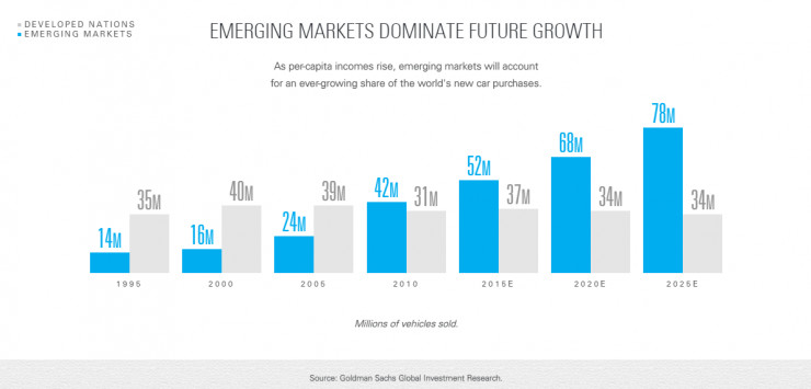 根据高盛的研究,发展中国家在未来几年对车辆的需求逐渐增长,且远远大于发达国家。