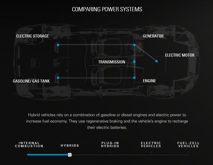 混动:混动汽车将会使用石油,柴油或电能作为能源,并能够通过再生制动和汽车的引擎来给汽车充电。