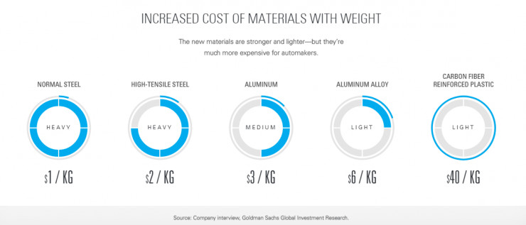 根据高盛的研究,普通钢材、高强度钢、铝、铝合金、碳纤维等材料的密度以此降低,但是价格却一个比一个高,其中碳纤维每千克就需要花费40美元。