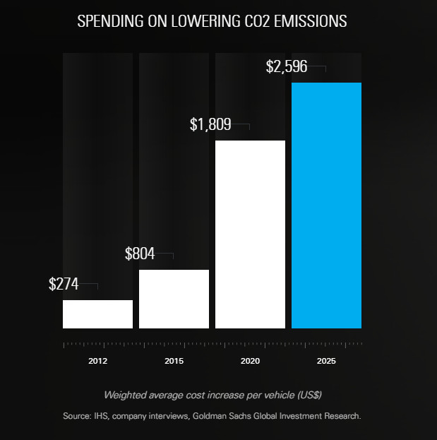 根据英国数据研究公司IHS和高盛的调查研究, 2025年,每辆车为降低二氧化碳排放量所花费的加权平均成本,将从2010年的274美元上升至2500美元。