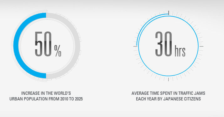 根据经济合作与发展组织和日本总务省的数据,全球城市人口从2010年到2025年将会有50%的增长。日本居民每人每年在交通拥堵上浪费的时间长达30小时。