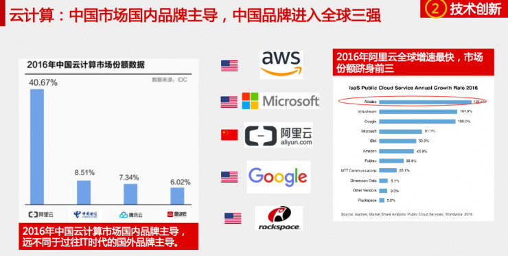 五年前,中国云计算刚刚起步,大量的用户都还是以自建数据中心,购买传统的以国外品牌IOE为代表的硬件和软件搭建信息系统为主,中国主要是技术应用者的角色,时至今日,中国公有云服务市场的前4位都是中国国内企业,并且携带自主创新的飞天分布式计算平台的阿里云为代表的中国云服务商开始走向全球,逐渐开始成为技术原创者的角色。