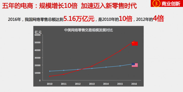 过去五年间,中国互联网发展呈现出快速发展的趋势,全球市值前十的互联网企业中,中国已占据三席。据报告数据显示,过去五年,中国网络零售从1.3万亿增长至5.2万亿;快递包裹数量从56.7亿,增长至313亿。第三方移动支付金额从0.2万亿增至58.8万亿。