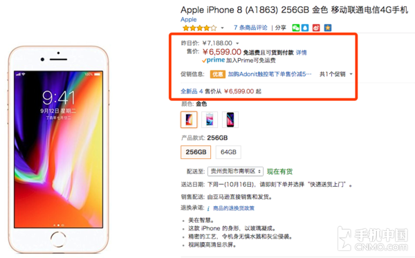 【手机中国 新闻】虽然iPhone X与iPhone 8/8 Plus同期发布,后者风头会被前者抢光的状况众人早已预料到,但没想到...市场的反响会比想象的更糟。今日(10月11日)亚马逊中国上,自营店中的iPhone 8与iPhone 8 Plus就进行了一次降价促销,整体价格下调的相当多,其中iPhone 8金色256GB版更是降了将近600元。