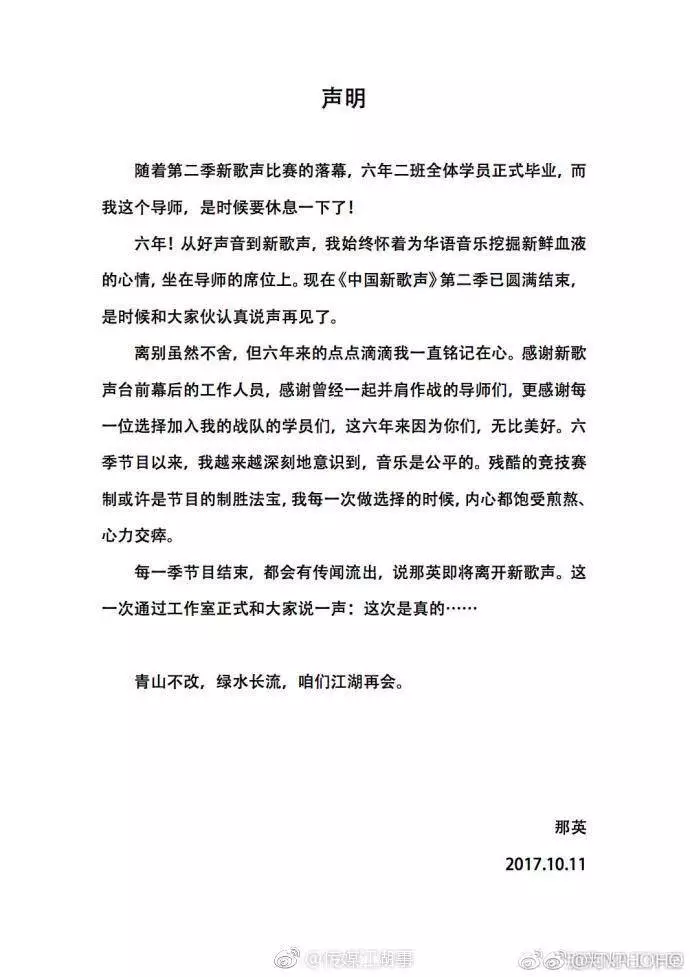 国内方面最后一则消息是跟综艺节目有关。今天的消息,那英工作室发出声明,宣布那英将不再参与后续《中国新歌声》的节目录制。
