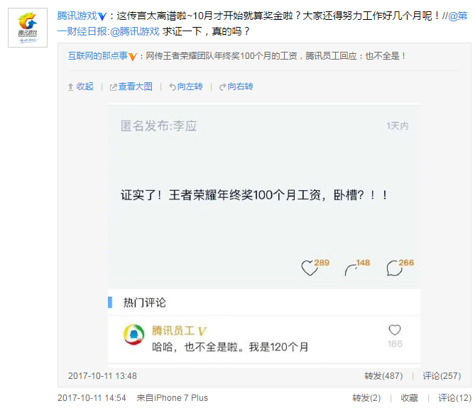 以阿里和腾讯之间的“亲密”关系,您都不用多想就知道腾讯肯定不会让阿里专美。就在马云在云栖会上指点江山,霸住大小媒体头条版面不撒手的当口,微博出了一个“谣言”——王者荣耀团队年终奖达到100个月工资。