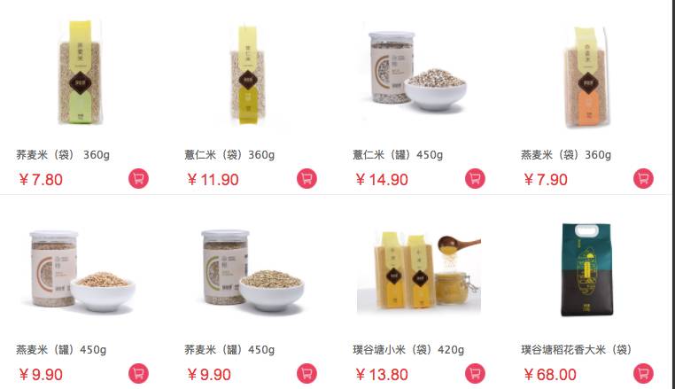 除此之外,曾经备受质疑的价格,也亲民了不少,我随手截了一个首页的专题商品图,可以看到,360克的荞麦米只要7.8元,而一袋稻花香米也不过68元,整个价格从几块钱到几十块钱不等,比起动辄几百块钱的商品,要便宜不少。
