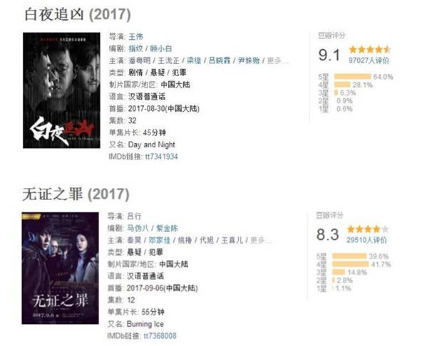 在豆瓣上,这两部网剧都赢得了网友的好评。《白夜追凶》的豆瓣评分高达9.1分,超越了上半年豆瓣评分最高的《白鹿原》。而《无证之罪》也高达8.3分,追平了《人民的名义》的口碑成绩。