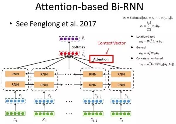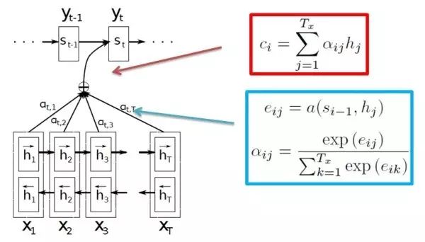 这个过程基本为:首先计算当前上下文的环境与每个源语言词语的相关度(一个得分),然后使用 softmax 公式,将这个相关度转化为概率的形式,最后用得到的概率乘以对应源语言端词的隐含表示作为该词对预测目标的贡献,将所有源语言端的词贡献加起来作为预测下一个词的部分输入。