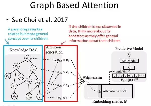 首先引入外部知识图谱,这个知识图谱是一个有向无环图,每个节点的父节点表示了一种相关但更宽泛的定义/概念。当医疗代码 c_i 信息稀少或者缺失时,可以考虑使用更加宽泛的定义。而 Attention Model 就是用来判断 c_i,c_g,c_c,c_a(从叶子节点到根结点上所有节点)对预测任务的贡献度。