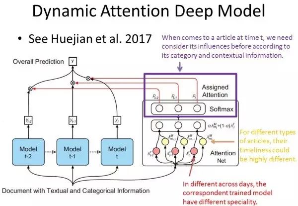 该论文中 Attention Model 的作用是,在第 t 时刻,给定新闻的文本和种类信息,不仅仅考虑第 t 时刻的模型(假设考虑一周中不同日子的影响,则有 7 个模型),我们也考虑该新闻在其他时刻的影响,然后根据新闻在各个时刻下的影响度随着时间的变化,综合考虑该新闻被选择的概率。 但是这个模型人工干涉的部分太多,随着假设的增加,模型会越来越复杂。