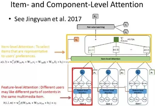 论文 Attentive Collaborative Filtering: Multimedia Recommendation with Item- and Component-Level Attention 介绍了基于领域知识的注意力机制如何用于推荐系统的。其中的 Attention Model 框架和上一节中介绍的 Hierarchical Attention Model 十分类似,唯一的不同就是它的输入使用了其他领域信息。
