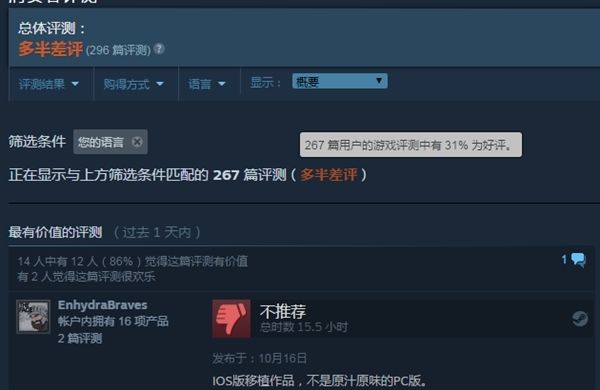 但玩家反馈状况不佳,截止发稿前267篇评测里仅有31%好评,总体评价为:多半差评。