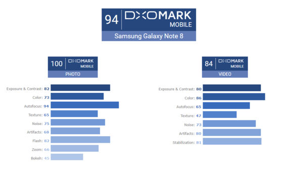 在拍照方面DxOMark发布了关于三星Galaxy Note 8的一些测评数据,这些测试数据表明三星Galaxy Note 8的总得分成绩为94分,是目前安卓阵营中最好的手机,也是目前拍照表现最好的Android手机,在单独静态照片拍摄环节,Galaxy Note 8拿下了当下市面上最高的100分,也是首款达到百分的手机。