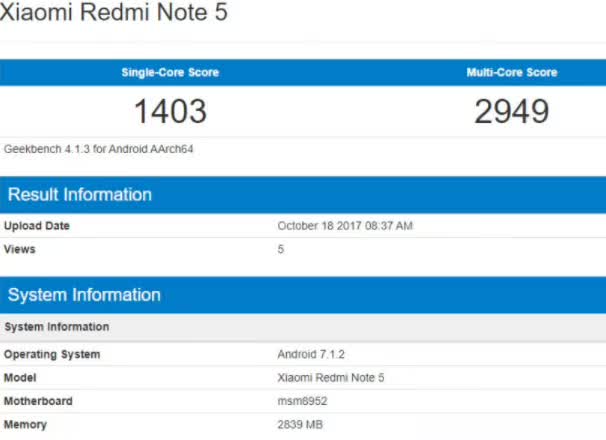 近日,知名跑分平台 GeekBench 上已经有红米 Note 5 现身,跑分成绩为单核 1403,多核为 2949。这款手机采用了 3GB 运存,搭载了 Android 7.1.2。主板型号则显示为 MSM8952,其实是骁龙 617 处理器的代号,不过它是不可能有这个跑分成绩的,因此很可能是因为 GeekBench 的识别错误或小米修改了关键硬件信息。