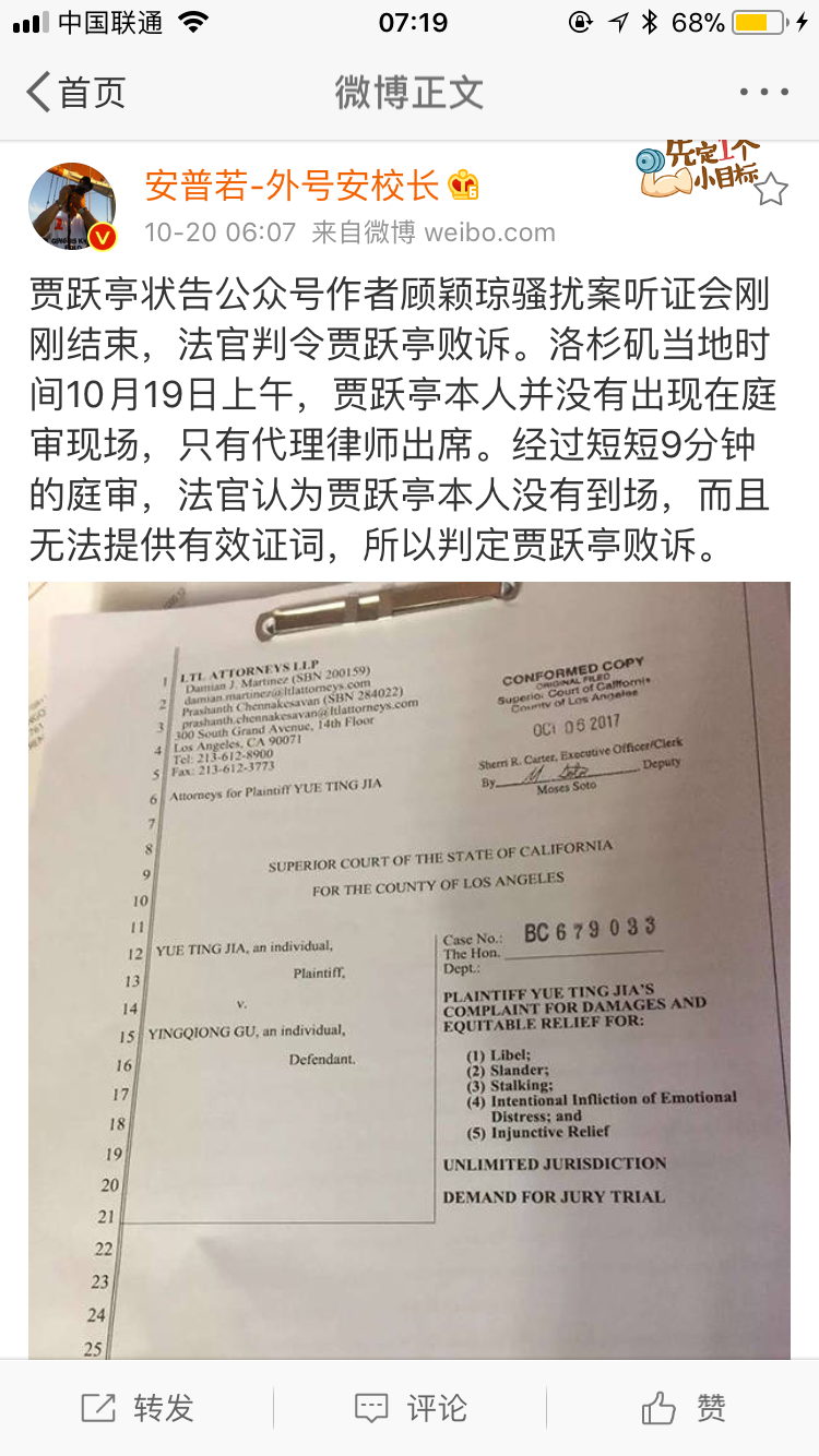 @界面【贾跃亭败诉 控告顾颖琼骚扰案被洛杉矶法官驳回】洛杉矶时间10月19日,贾跃亭状告公众号作者顾颖琼骚扰案听证会结束,贾跃亭本人并没有出现在庭审现场,只有代理律师出席。经过短短9分钟的庭审,法官认为贾跃亭本人没有到场,而且无法提供有效证词,判定贾跃亭败诉。