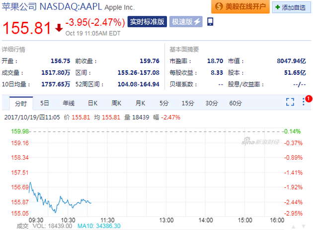 @新浪科技【苹果股价下挫超2.5%】北京时间10月19日晚间消息,受苹果公司削减iPhone 8和iPhone 8 Plus订单消息的影响,苹果股价在今日盘前交易中一度下滑1.5%。开盘后,其股价一度下跌超过2.5%。