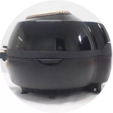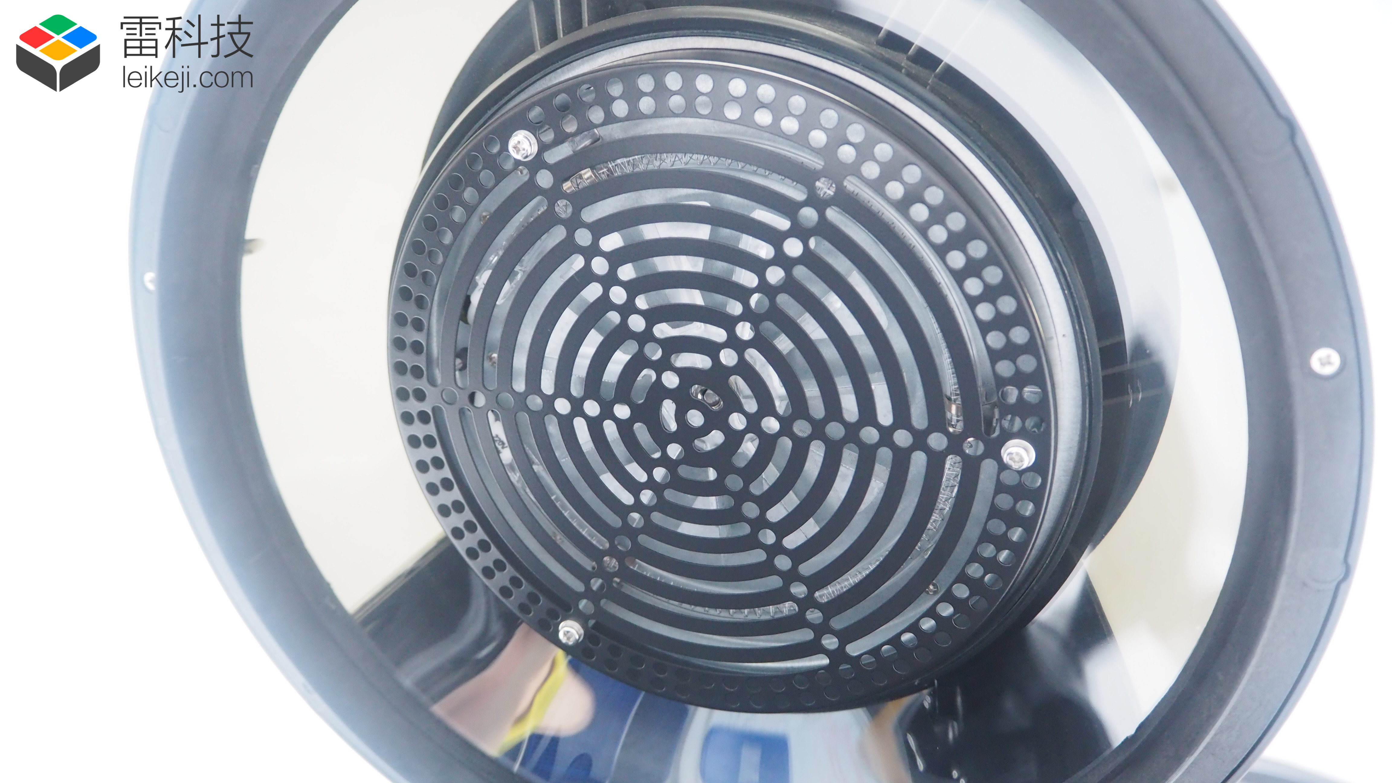 打开这款空气炸锅,可以看到盖子中配备了一个大风扇,运行时将热量抽取,最后从散热孔排出。