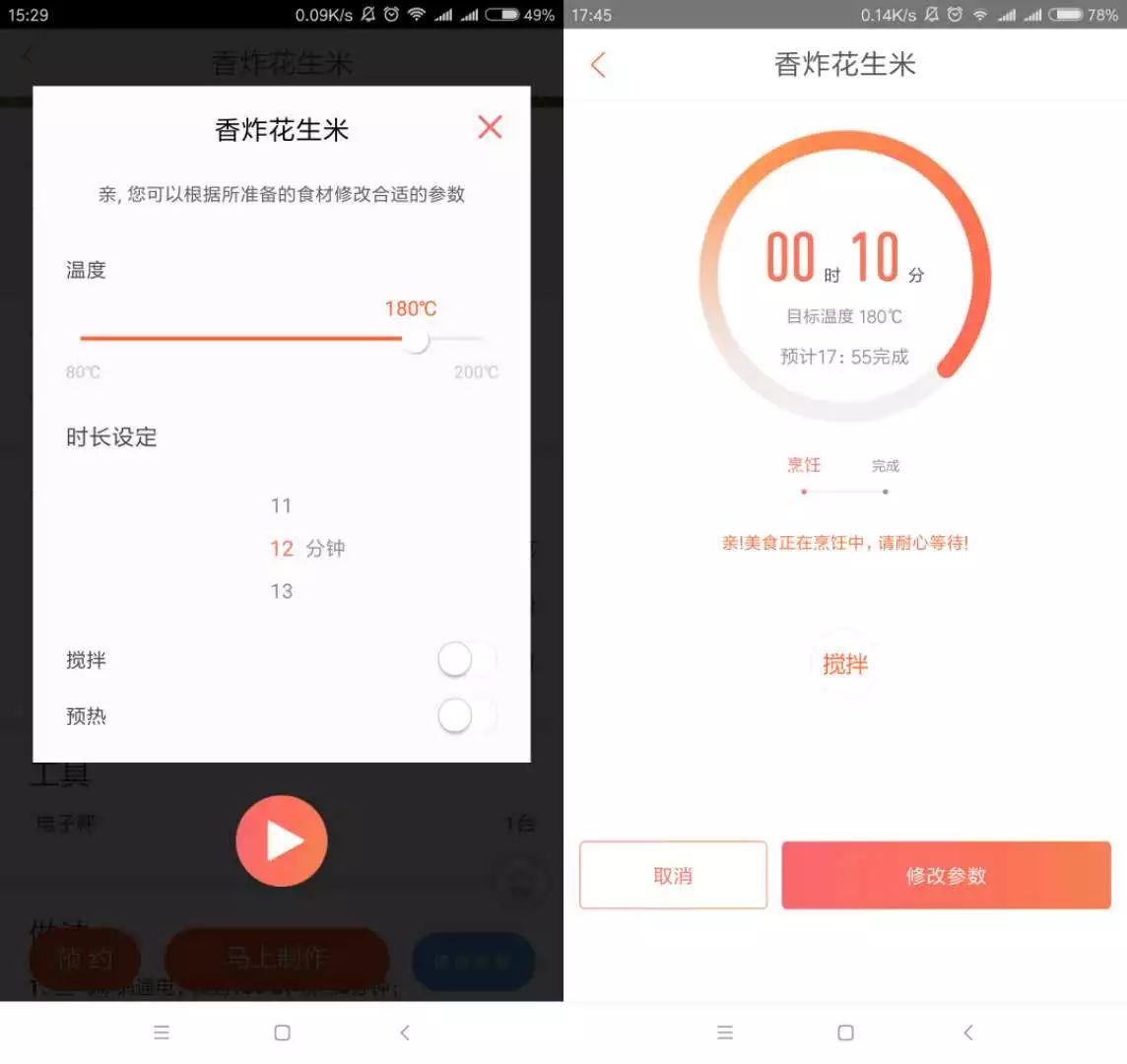 和直接在产品上操作相比,在 APP 中操作多了一项云菜谱功能。除了触控板上的薯条、鸡翅等分类,用户自己琢磨出来的菜谱也可以分享到 APP 中,其他用户可以查看使用,同时也可以根据实际情况对烹饪温度和时间做出调整。
