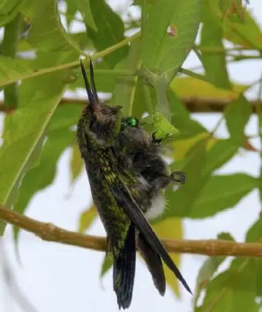 这些目击报告来自13个不同的国家,不过主要还是来自美国的,一共记录下了12个螳螂物种的吃鸟行径。最容易倒霉的是什么鸟?答案就是体型十分小巧的蜂鸟了……目击者们最常报告被螳螂捕捉的鸟类物种就是红喉北蜂鸟(Archilochus colubris)。